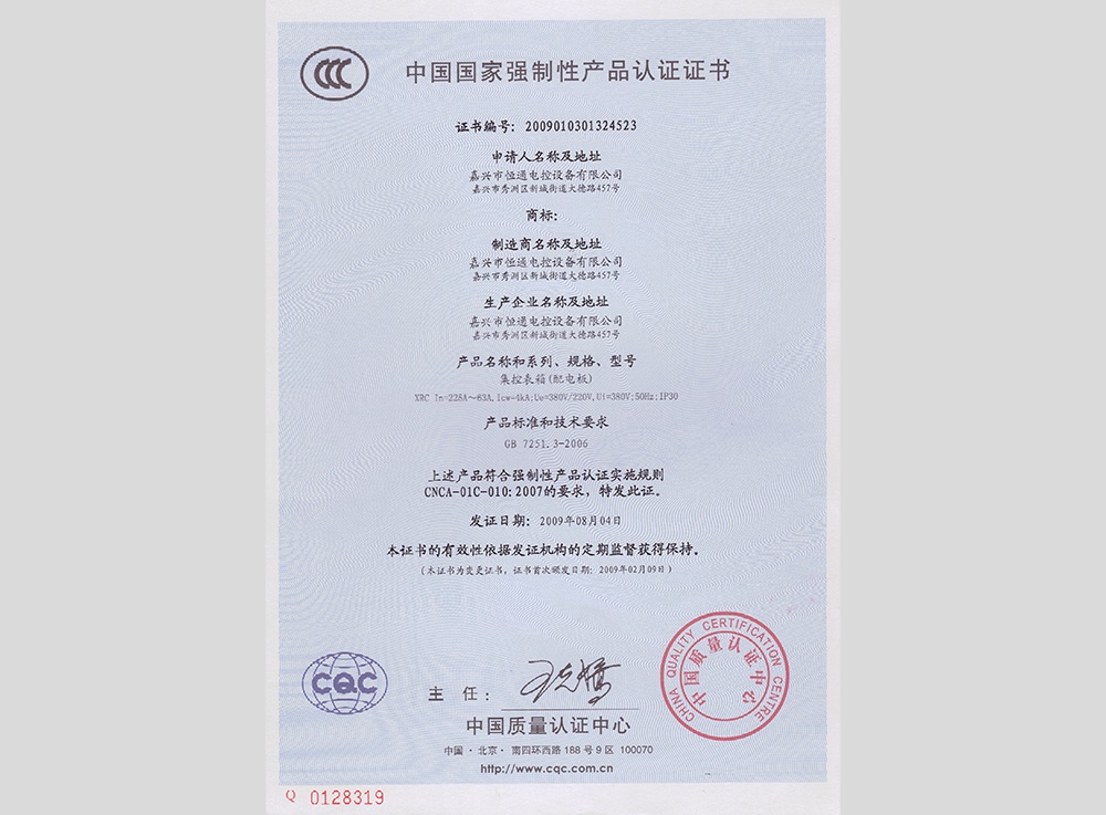 認領(lǐng)"3C"證書(shū)及型式試驗報告,產(chǎn)品分別有:高低壓 箱式變電站XBW、高壓中置柜KYN28、抽出式低壓 成套配電柜MNS、低壓抽出式開(kāi)關(guān)柜GCS、低壓配 電柜GGD、電容補償柜GGJ、母線(xiàn)槽CMC、集控表 箱XRC、玻璃鋼集控表箱XRD、低壓動(dòng)力柜XGL、電 纜分支箱HWF、低壓配電箱XRL、模數化照明箱PZ30。